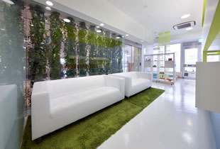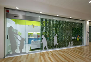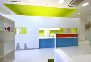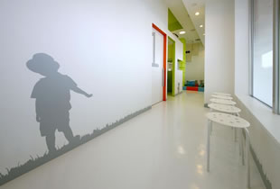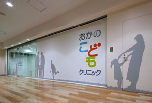 おかのこどもクリニックは”街に現れた自然公園”をイメージしてインテリアが計画されました。こどもたちが木々と触れあい、原っぱを駆け回る。そんなシーンが自然に思い浮かぶ小児科。こどもたちには、樹木や草花から、癒され、エネルギーをもらい、病気になんか負けないですくすくと元気に大きくなっていってほしい、そういう願いが籠められています。